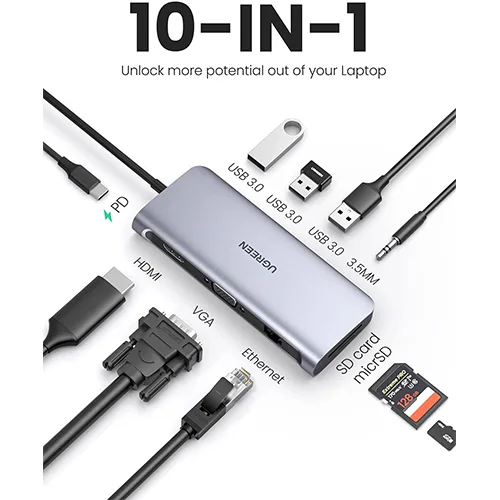 This 10-in-1 USB-C Dock features a Gigabit Ethernet, a type C PD charging port, a 4K HDMI port, 3 USB 3.0 Ports, a SD/TF card reader, a 3.5mm Audio jack and a 1080P VGA port. All hub ports can be in use simultaneously, allowing you to connect a keyboard, mouse, USB driver, external Disk to MacBook Pro